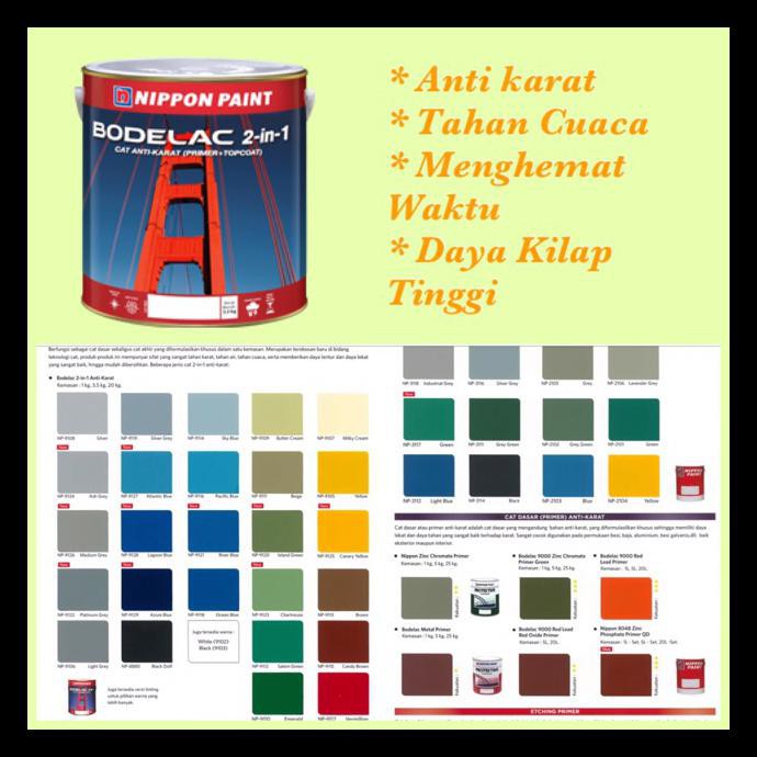 Cat ini bersifat cepat kering dan tahan lama. Avian Glovin Anti Karat. NIPPON BODELAC 2 - 1 CAT BESI ANTI KARAT 9103 BLACK 1 KG - 9103 BLACK GLOS saat ini berdagang seharga Rp122300 tetapi memesan secara online di luar harga yang Anda butuhkan untuk membayar biaya pengiriman dan kami akan memberikan mereka yang berada di KOTA JAKARTA TIMUR freeship.